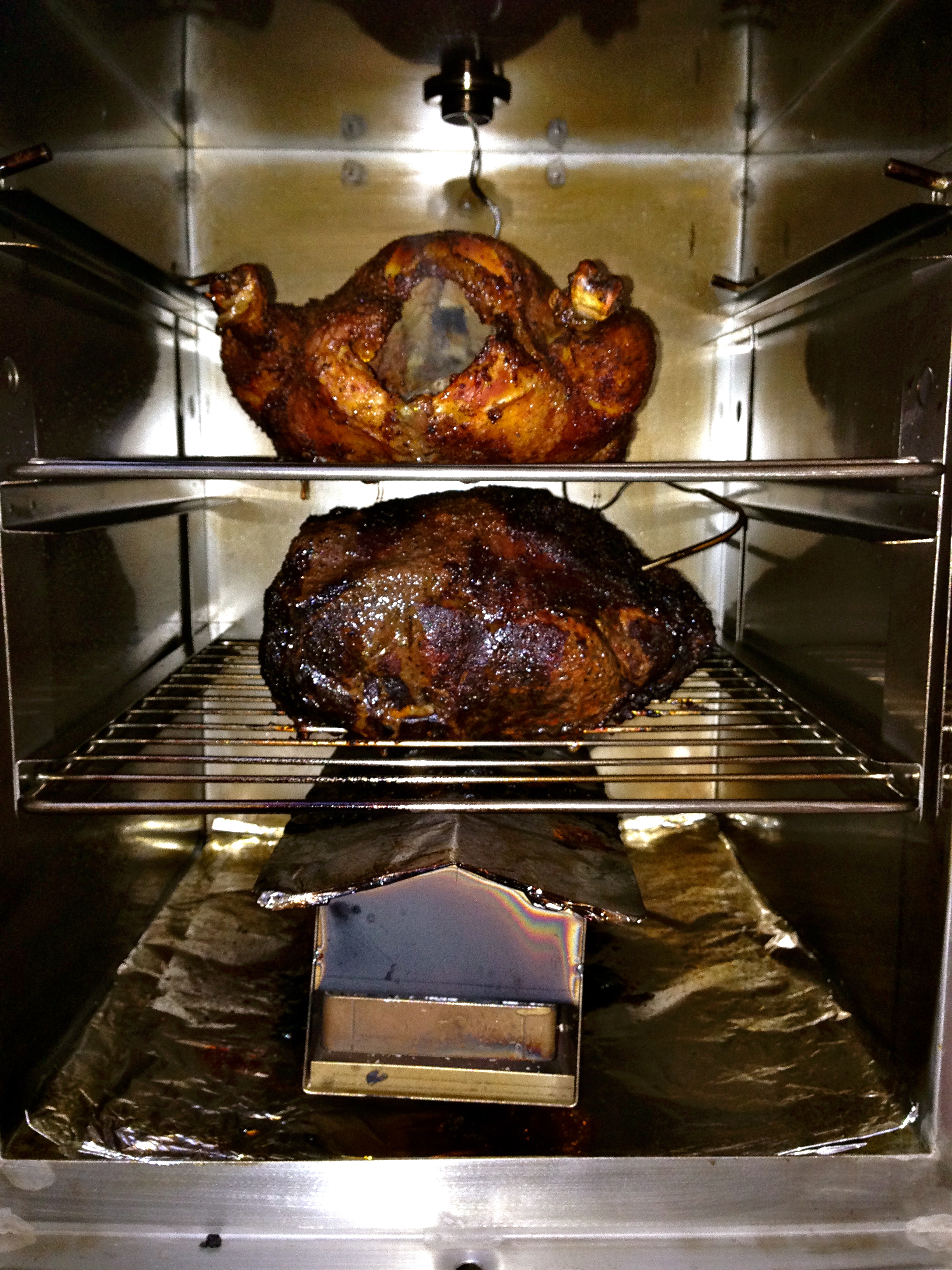 Andy put the pork shoulder in with a few wood pieces, turned the smoker on, and set it to 225 degrees. The ease of an electric smoker is amazing! He simply put the meat in, closed the door and never touched the Smoker again until the chicken went in 4 hours after the pork. Truly set it and forget it. Since Andy is an all protein eater and Joiwind is the picky one, the chicken was put above the pork (surely there is a joke in there somewhere), so as not to contaminate the chicken. Also, a few more wood pieces were added at that time to ensure the chicken also received it’s dose of fresh smoke. Again, it was as simple as closing the door and walking away. (Side note: with breakfast out and the anticipation of a fabulous feast, we decided sharing one of our healthy shakes for lunch would be the proper preparation to ensure we did not feel like the Pillsbury Dough Boy the next morning. That and a tequila shot.) In total the pork was in the smoker for about 7 hours and the chicken about 3 hours.