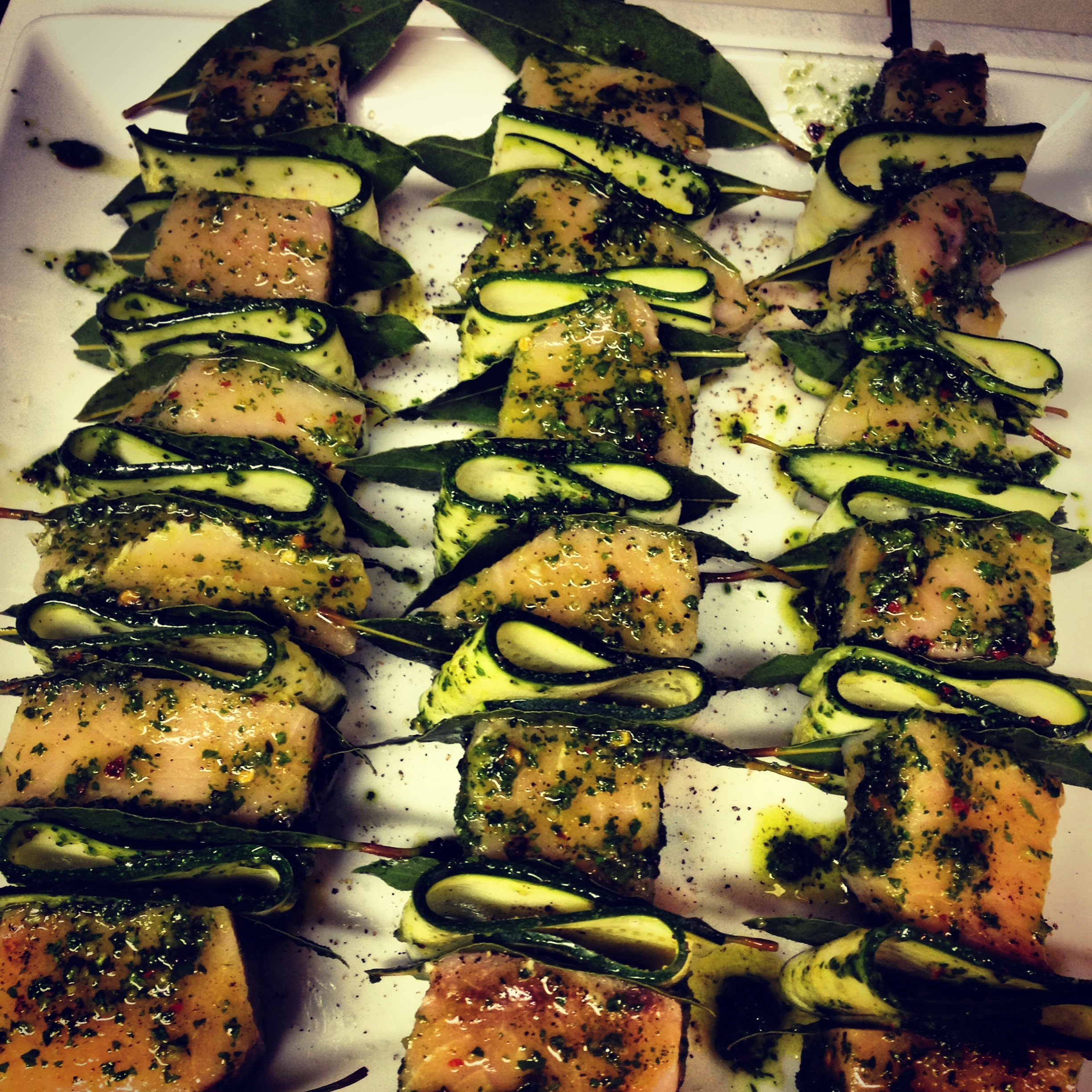On long skewers (3-4) thread ingredients in the following order: a bay leaf, a piece of fish, a bay leaf, tri-folded zucchini ribbon, a bay leaf, a piece of fish, etc. Season the skewers with salt and pepper and brush liberally with the parsley mixture. Cover and marinate in the refrigerator for one hour.